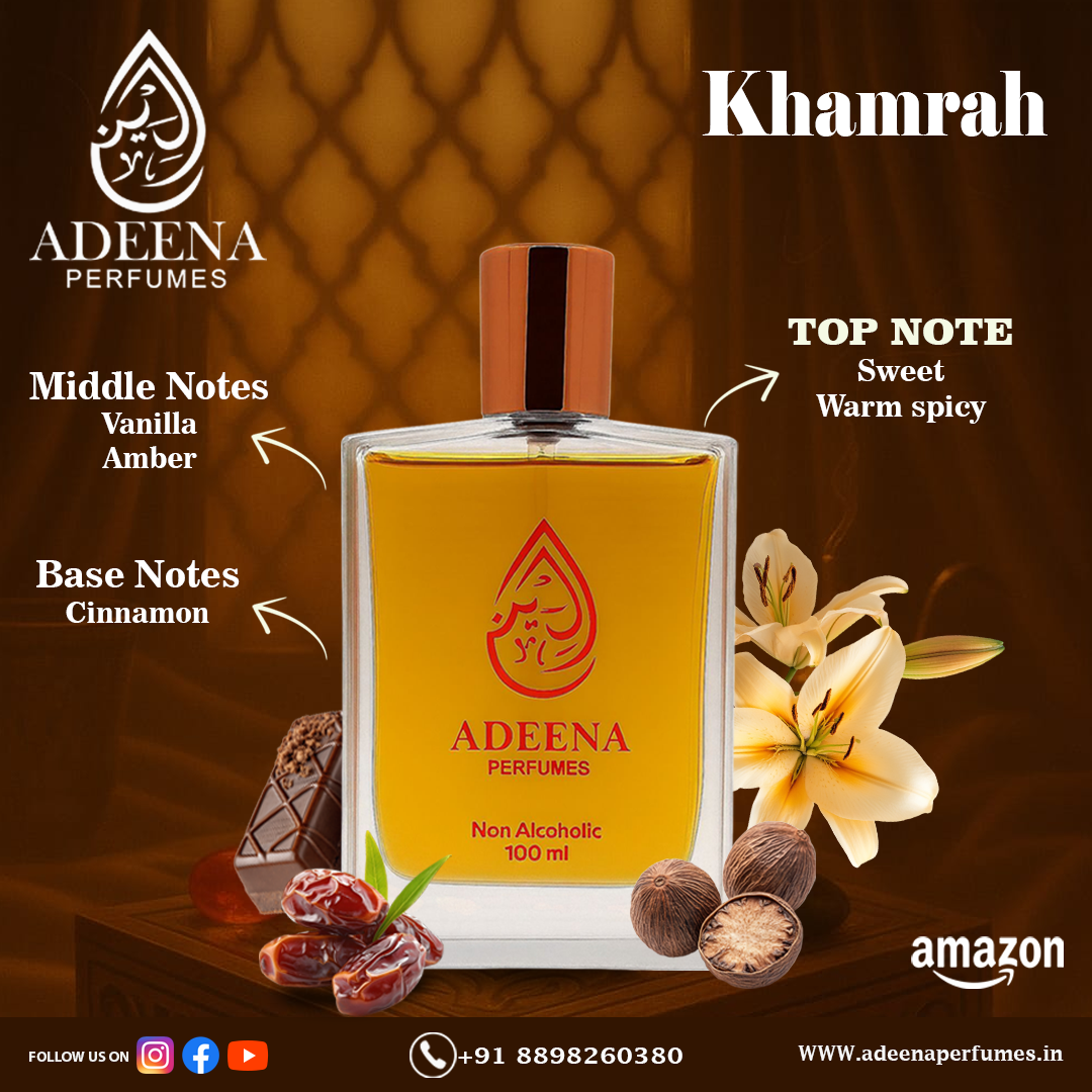 Khamrah is a Oriental Spicy fragrance for women and men. Top notes are Cinnamon, Nutmeg and Bergamot; middle notes are Dates, Praline, Tuberose and Mahonial; base notes are Vanilla, Tonka Bean, Amberwood, Myrrh, Benzoin and Akigalawood.