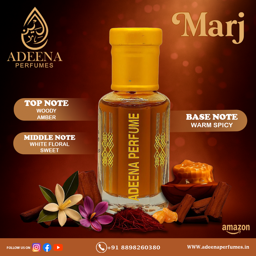 Marj is a fragrance for women and men. Top notes are Oud, Honey, Pink Pepper, Nutmeg, elemi, Bergamot and Mandarin; middle notes are Cashmere Wood, Orange Blossom, Saffron, Jasmine, Patchouli, Cinnamon and Vetiver; base notes are Agarwood, Saffron, Ambergris, Leather, Raspberry, Oakmoss, Violet, Amber, Sandalwood, Musk and Pear.
